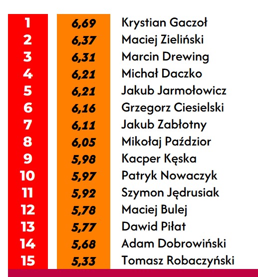 Najwyższą średnią w pojedynczym meczu otrzymał Kuba Zabłotny – 8.80.